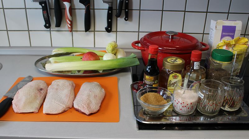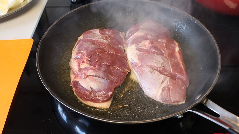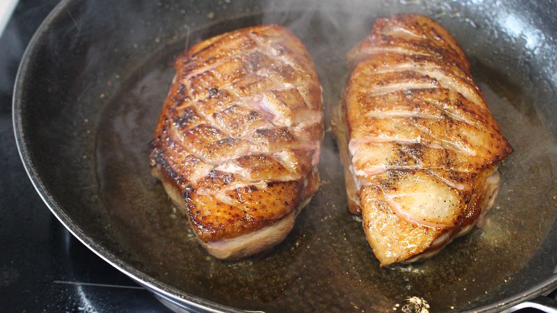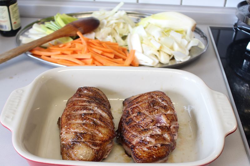 ördek gögüslerini verev keselim, tuz ve karabiber ile baharatlayalim.. kizgin tavada yagli kismi altta kalacak sekilde kizartalim… kisa sürede yagini birakacaktir. cevirip diger tarafinida kizartalim. firin tepsisine cikartalim.. tavadaki yagi atmiyoruz sebzeleri soteleyecegiz. önceden isinmis 160 derece firinda 30-40 dakika pisirelim.. bu pisme süresi icini sulu seviyorsaniz düsürebilirsiniz. cok pismis seviyorsaniz 40 dakika yeterli gelecektir. firinda cikartalim.. dilimlere keselim…