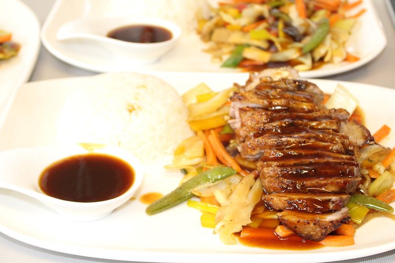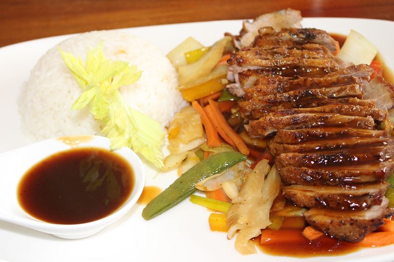 tabagin bir kenarina sade pirinc pilavi,  sebze sotesi koyalim, dilimledigimiz ördegi sebze sotesinin üzerine koyalim, hazirladigimiz sostan bir kepce kadar ördek ve sebze sotemize dökelim.. enfes menümüz hazirdir. afiyet olsun