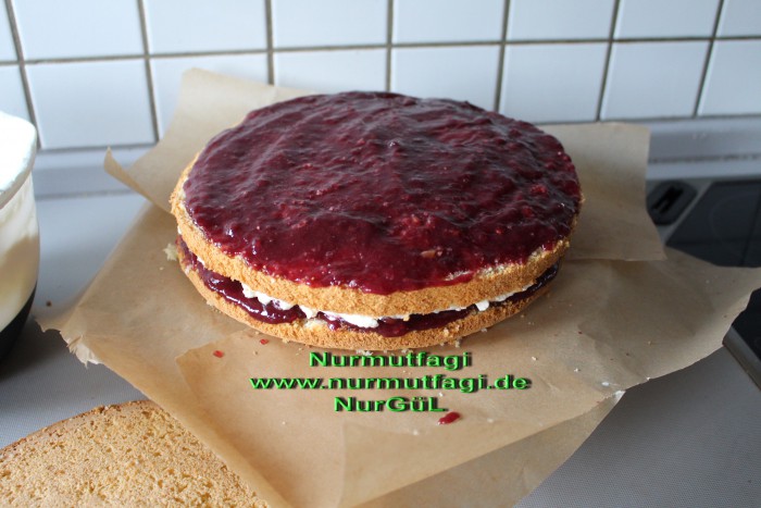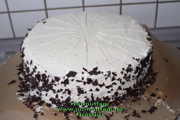 Pandispanyamizin alt katina soguyan kiraz sosumuzun yarisini dökelim, üzerine ayirdigimiz kirazlari yerlestirelim… 3-4 kasik krema sürelim ve ikinci kati yerlestirelim… teri kalan kiraz sosumuzun tamamini pandispanyamizin üzerine sürelim krema sürüp 3.kat pandispanyamizi yerlestirelim… heryerini krema ile kapliyalim… üsüne pasta dilimleme formu ile sekil verelim…krema torbamiza bir miktar krema dolduralim üzerine süsler yapalim… krema siktigimiz süslerin üzerine ayirdigimiz kirazlari yerlestirelim… pastamizin kenarini cikolata parcalari ile kapliyalim… ortasinada cikolata parcalari serpelim… afiyet olsun…