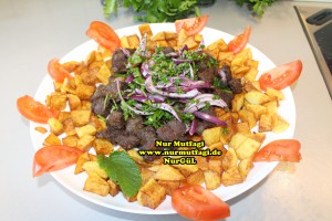 Patatesleri küp keselim, firitözde veya bol yagda tencerede kizartalim.. servis tabagina alalim.. ortasini acalim, kizarttigimiz cigerleri koyalim.. sogan piyazi ile servise hazirdir.. afiyet olsun