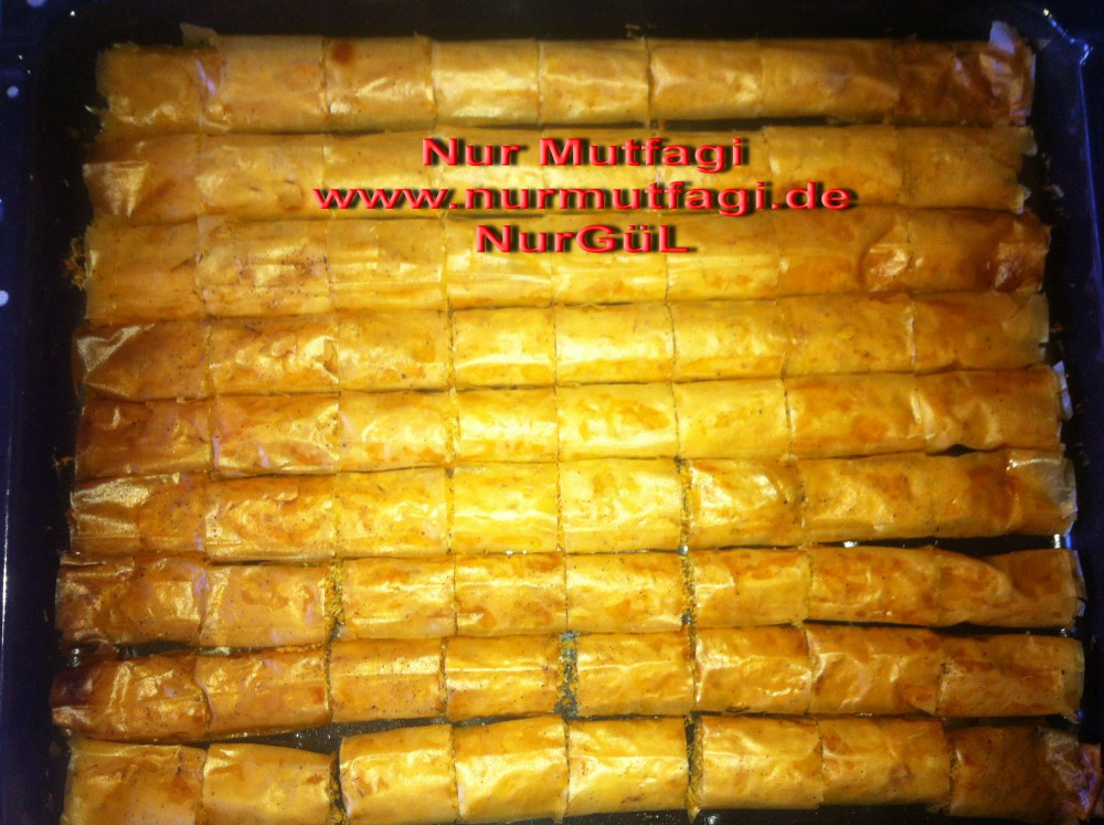 Kadayifi bir kabin icersinde sivi yag ile tel tel ayiralim, icersine iri cekilmis cevizi döküp karistiralim… büyük bir tavada hafif renk alana kadar kavuralim… Baklavalik yufkadan bir tane alalim bu kadayif harcindan uzunlamasina bir miktar koyalim ve sikica rulo yapar gibi saralim… yufka ve tel kadayif bitene kadar ayni islemi uygulayalim, 4-5 cm uzunlugunda keselim… yaglanmis firin tepsisine dizelim…