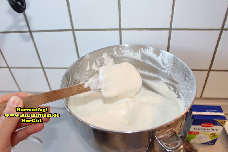 kremalari derin bir kabin icine bosaltalim, kremsanti ile sertlesene kadar cirpalim.. mascarpone ve putra sekerinide ilave edip devam cirpalim.