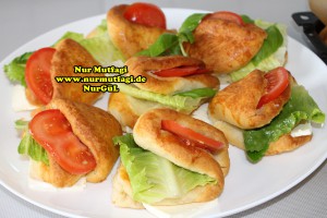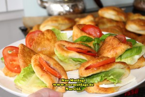 Yapilisi: Mayayi ilik süt ve seker ile eritelim. siviyagi kabartmatozunu, tuzu yumurta beyazini ve unu ekleyip hamuru yoguralim.. mutfak sefiniz varsa onda yogurabilirsiniz veya ekmek makinenizin hamur yogurma ayarinda, hicbiri yoksa elinizle güzelce yoguralim. üzerine seffaf folye ile kapatalim, 2-3 katina gelene kadar dinlenmeye birakalim.. gelen hamurdan mandalina kücüklügünde bezeler yapalim.. her bir bezeyi tabak alti büyüklügünde acalim, actigimiz hamurun üzerine heryerine gelicek sekilde firca ile siviyag sürelim, ortadan katlayalim, tekrar siviyag sürelim, tekrar katlayalim, yagli kagit koyulmus firin tepsisine cepli pogacalarimizi dizelim.. üzerine yumurta sarisi sürelim, önceden isinmis 180 derece firinda alti üstü kizarana kadar pisirelim. pistikten sonra cepli pogacalarimizin arasina peynir dilimleri, domates dilimleri ve salata yapraklari ile doldurup cay ile birlikte mis gibi servis icin yemeye hazirdir..