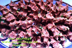 Öncelikle bir kabın içine yeşil soğanları ve maydanozları çok ince olacak şekilde doğrayıp atıyoruz. Ardından çiğ köfteyi yoğuracağımız büyük leğenin içine, çekilmiş kırmızı eti, tuzu, isotu, karabiber, salçayı, doğranmış kuru soğanı alıp yoğurmaya başlıyoruz. Yaklaşık 25 dakika bu karışımı yoğurduktan sonra yavaş yavaş az az çiğ olan köftelik bulguru ekleyip, yoğurmaya devam ediyoruz. Bütün bulgur karışımın içine ilave edilince, çok az su katarak bulgurlar yumuşayıncaya kadar yoğuruyoruz, bu esnada biraz sivi yag ilave edip devam yoguruyoruz…
