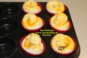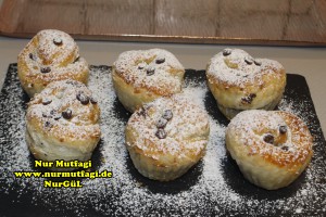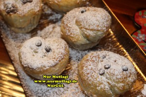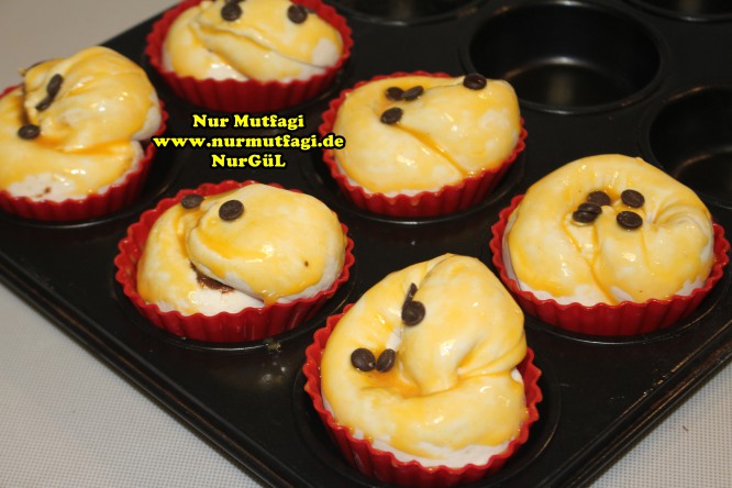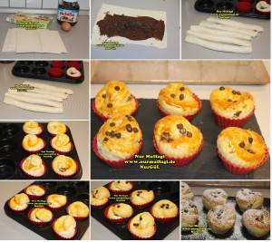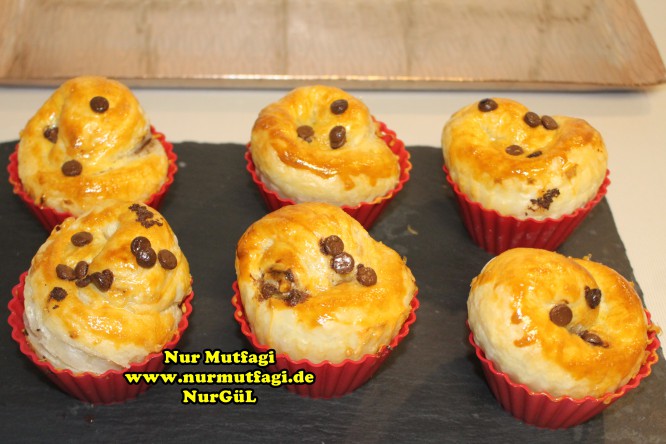 Yapilisi: milföy hamurunu biraz merdane ile büyültelim, ortasina bir kasik nutella sürelim ve biraz damla cikolata serpelim, ( damla cikolatasiz sadede yapabilirsiniz ) rulo saralim, muffin kalibina silikon olandan kullandim yaglamadan milföy muffinleri dügüm sekli vererek kalibimizin icine oturtalim.. üzerine firca ile yumurta sarisi sürelim, damla cikolata serpelim ve önceden isinmis 190 derece alt üst ayarda kizarana kadar yaklasik 30 dakika pisirelim… kaliptan cikartalim ve putra sekeri serpelim, bu kadar 🙂 afiyet olsun.. cok pratik bir tarif cocuklarin severeke yiyecegi bir muffin tarifi