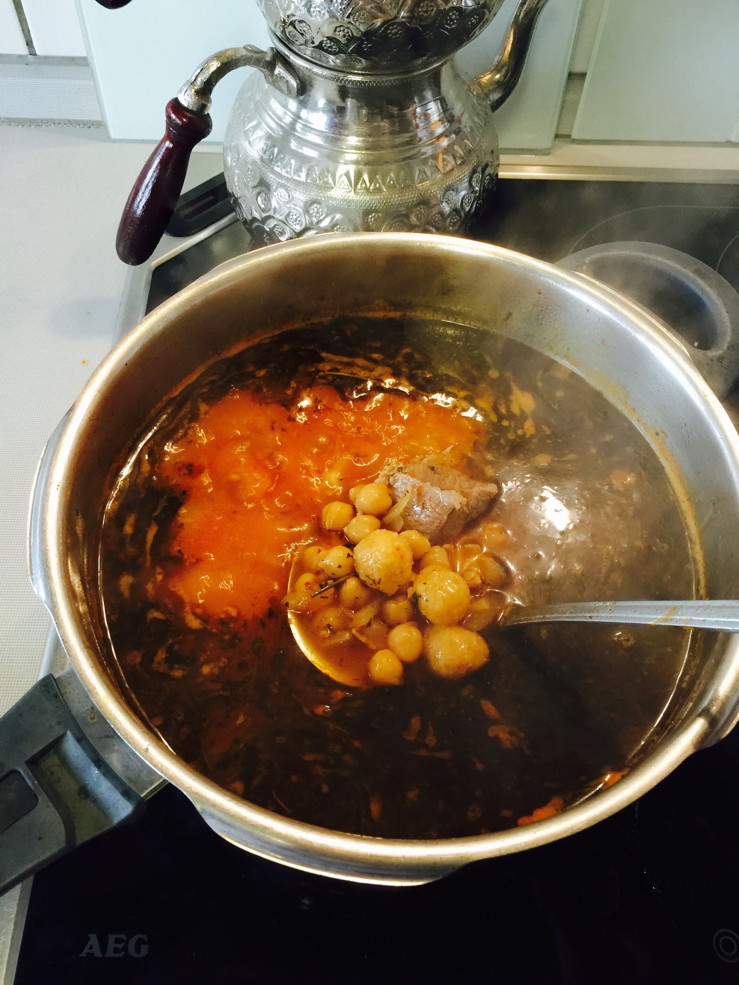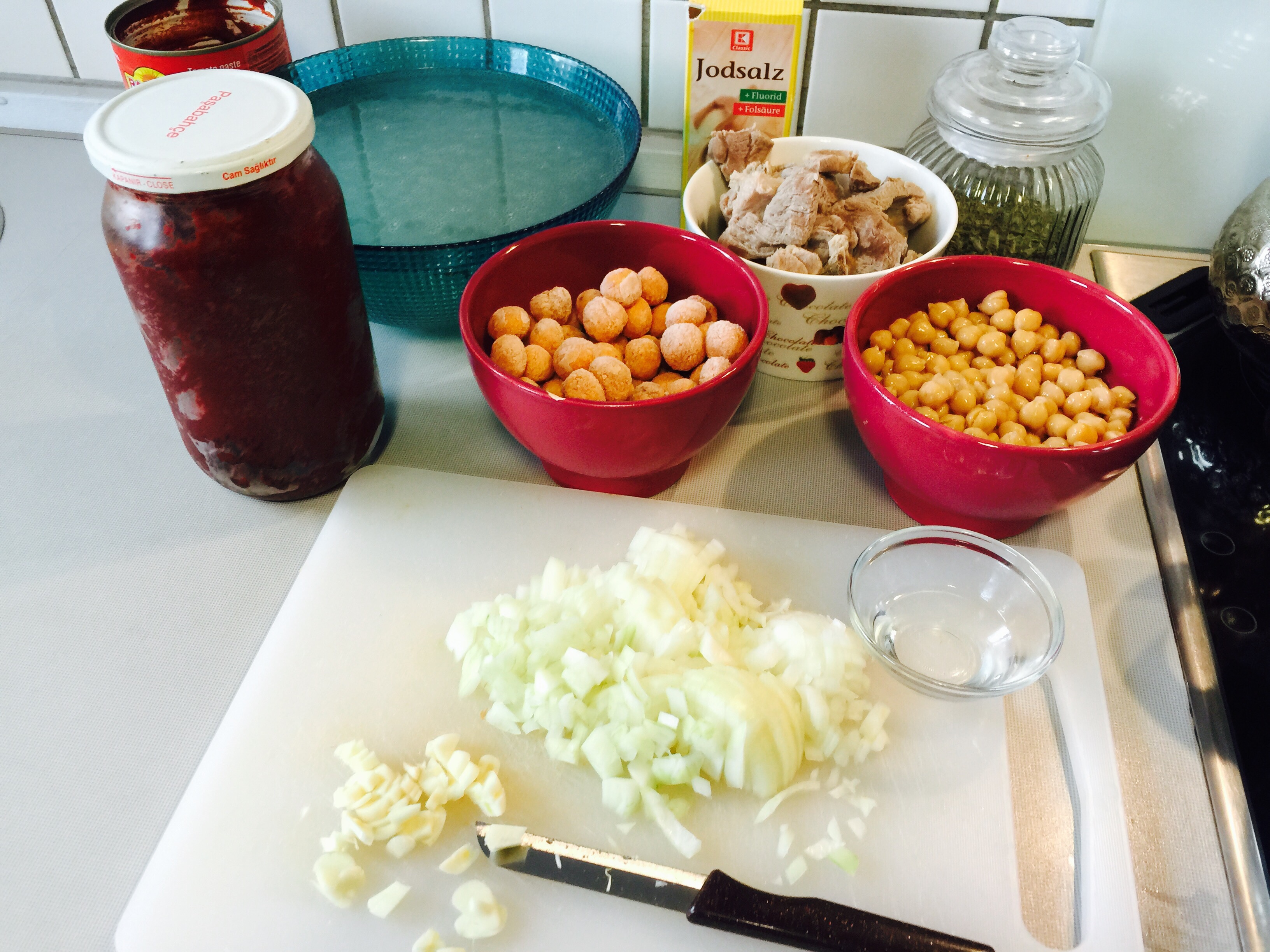 Kaynayan yemeğe topalak ve nohutları ekleyelim, Eti’de ekleyip tuzunu ilave edip orta Ateş’te pişirelim..