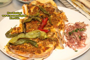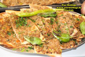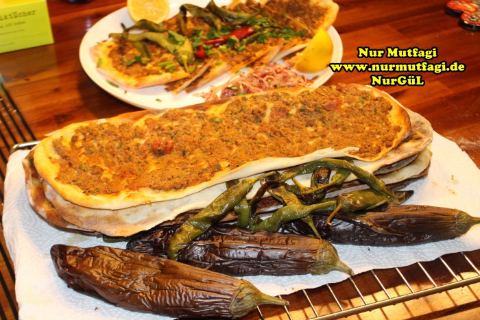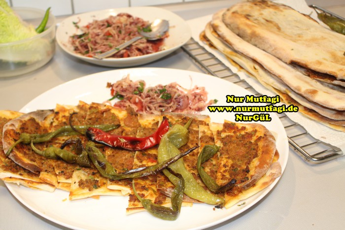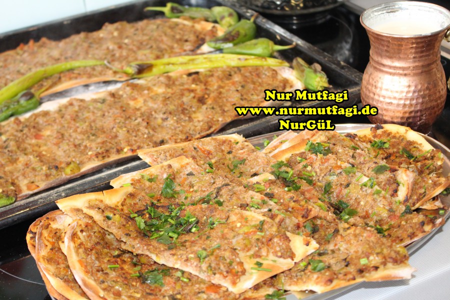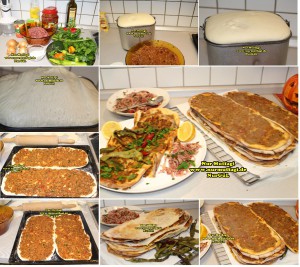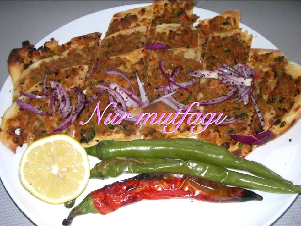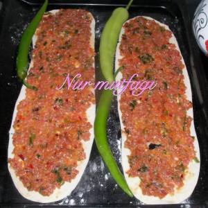 Yapılışı: Hamur icin gerekli malzemelerden hamur yoguralim… iki üc katina gelen dinlenmiş hamurdan küçük bezeler alın ve ince uzun tepsinizin boyu kadar açın. ( normalinde çok uzun oluyor ama normal fırında bu kadar.) iç malzemesıni hazırlayın, soğanı, domates ve biberleri rondoda kıyın. Bütün malzemeyi Kıyma baharatlar ve zeytinyağı ıle tatlandırın. 1-2 yemek kaşığı kıymalı harçtan alın açmış olduğunuz hamurun üzerine yayın. elinizi biraz islatarak dagitma islemi daha kolay oluyor…300 derecede fırında alt üst yaparak pişirin. İç malzemeniz bitene kadar aynı işlemi uygulayın. Limon, soğan piyazı, salata ve ayran ile servis yapın… Afiyet olsun…