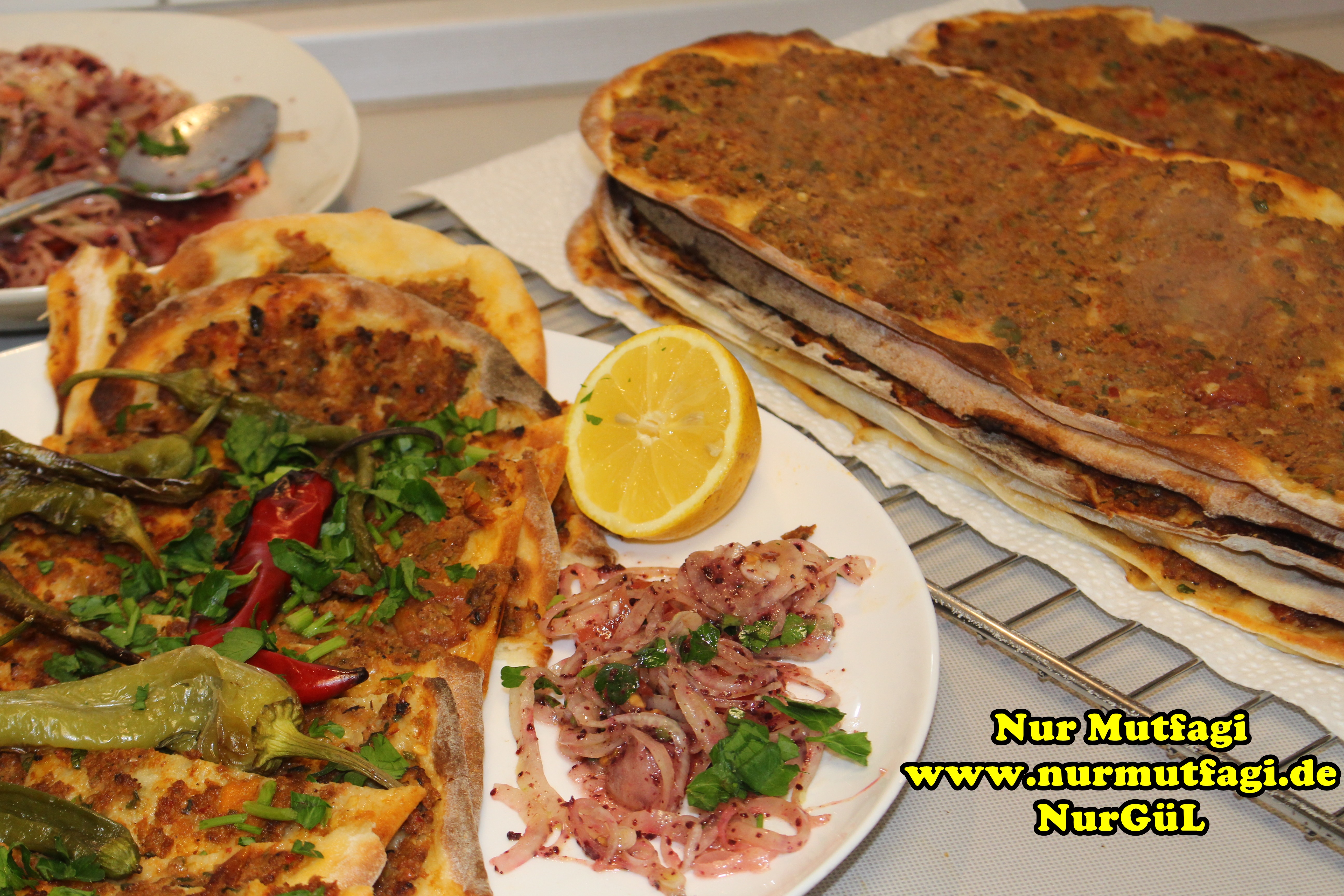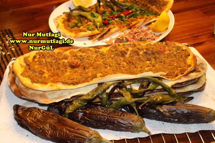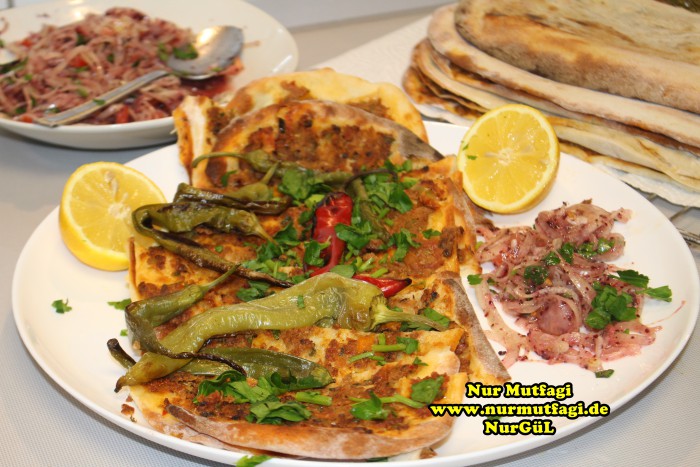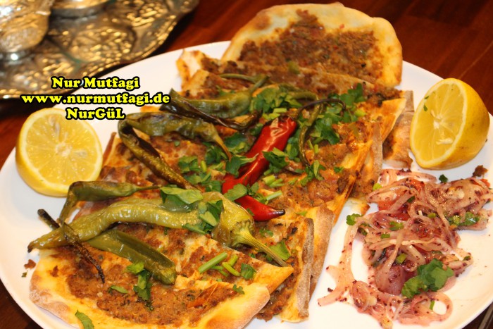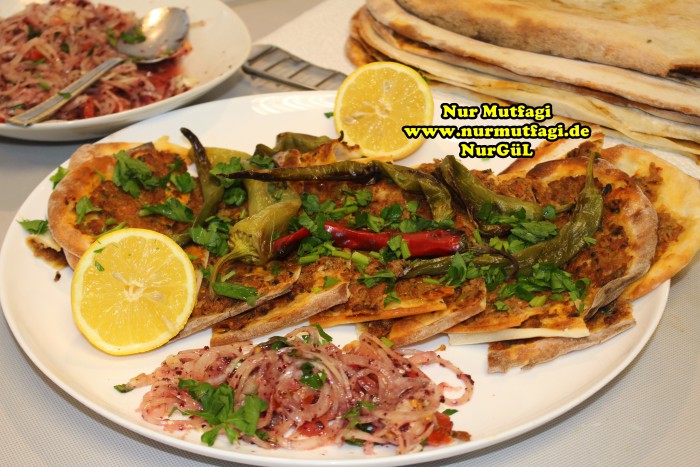 Yapılışı: Hamur icin gerekli malzemelerden hamur yoguralim… iki üc katina gelen dinlenmiş hamurdan küçük bezeler alın ve ince uzun tepsinizin boyu kadar açın. ( normalinde çok uzun oluyor ama normal fırında bu kadar.) iç malzemesıni hazırlayın, soğanı, domates ve biberleri rondoda kıyın. Bütün malzemeyi Kıyma baharatlar ve zeytinyağı ıle tatlandırın. 1-2 yemek kaşığı kıymalı harçtan alın açmış olduğunuz hamurun üzerine yayın. elinizi biraz islatarak dagitma islemi daha kolay oluyor…300 derecede fırında alt üst yaparak pişirin. İç malzemeniz bitene kadar aynı işlemi uygulayın. Limon, soğan piyazı, salata ve ayran ile servis yapın… Afiyet olsun…