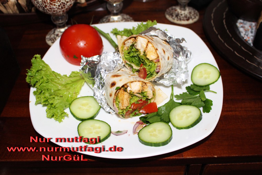 Yapilisi: Tavuk file etlerini kücük kusbasi halinde yemeklik dograyin, zeytinyagini isitip tavada etleri kavurun… tuz ve baharatlar ile tatlandirip ocaktan alin… salata icin malzemeleri ince dilimler halinde dograyin… dürüm ekmegini isitip icersine tavuk kusbasi etinden, salata, sogan domates ve pul biber serperek dürüm yapariz, isterseniz folyo kagidina skica sarip servis yapin, böylece cocuklar yerken dagilmaz ve ic harcini dökmezler 🙂