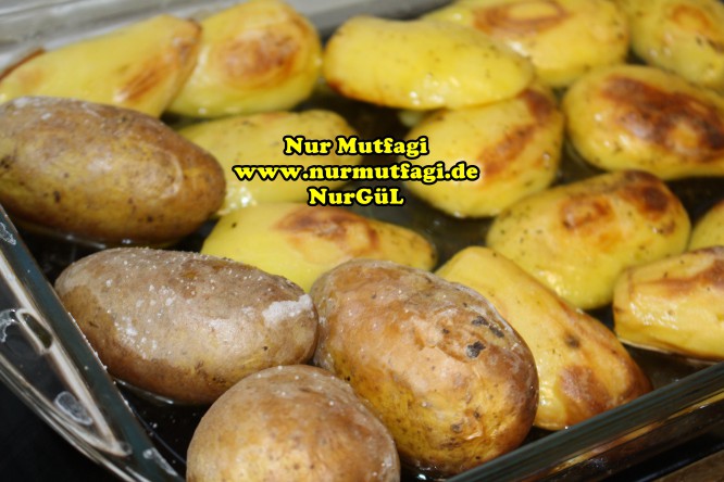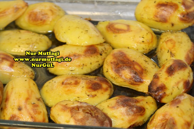 Patateslerin kabuklarini soyalim, birkactanesini soymadan biraktim… ortadan ikiye keselim, tepsinin altini biraz zeytinyagi dökelim ve patatesleri kestigimiz kisim altta kalicak sekilde tepsiye dizelim, tuz ve biraz kekik serpelim birazda zeytinyagi gezdirelim, önceden isinmis 190 -200 derecede yumusayip renk alana kadar pisirelim… ( balik ile ayni anda pisirdim ) afiyet olsun