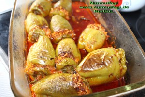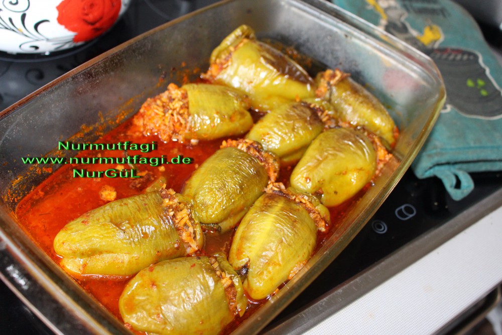 bütün malezmeleri bir kabin icersine alip güzelce harmanliyoruz… biberlerin kapagini kesip icersinde cekirdeklerini cikartip harcimiz ile dolduruyoruz… tekrar kapagini kapatip, borcama yatay sekilde dolmalarimizi yerlestiriyoz… yarisina gelicek kadar salca tuz ve  ilik su karisimini  döküyoruz, aralarina sarimsak yerlestiriyoruz ve üzerine tereyagi parcalari koyuyoruz… önceden isinmis firinda 180 derecede yaklasik 30 dakika pisiriyoruz… Not: kullandiginiz pirince göre pisme süresi degisebilir, normal pilavlik pirinc degilde ince uzun pirincten kullanmanizi tavsiye ederim… afiyet olsun