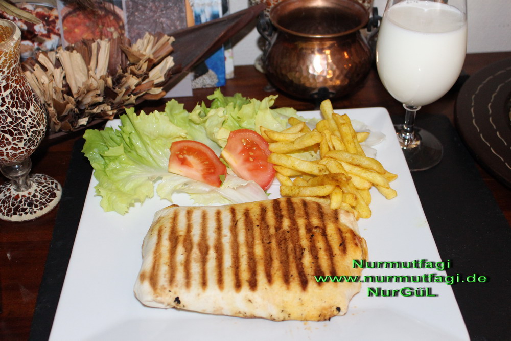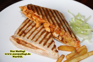 Yapilisi: Tavuk fileleri ince ince kesiyoruz, tavaya 3-5 yemek kasigi zeytinyagi koyuyoruz ve tavuk filelerimizi kizartiyoruz, tuz ve biber ile tatlandiriyoruz…