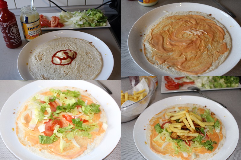 Lavas ekmegimize bir yemek kasigi mayonez ve sevdiginiz miktar aci sos döküyoruz… üzerine salata, domates ve sogan dilimlerini yerlestiriyoruz… kizarttigimiz etimizi ve patates kizartmamizdanda bir miktar koyuyoruz, yanlarini ortaya getirecek sekil kapatiyoruz, yani bohca sekli vermeye calisiyoruz… ( ici cok dolu olursa ve lavas ekmegi kücük olursa tam bohca sekli olmuyor 🙂 )