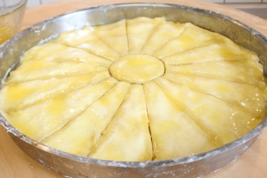 katlayarak zarf sekline getirdigimiz yufkalari tekrar merdane ile büyükce acalim..tepsinin tabanini yaglayalim, actigimiz yufkayi tepsiyi üzerine koyup keselim, kestigimiz yufkayi tepsiye yerlestirelim, kenarindan artan parcalarida yerlestirelim.. her ara kata firca ile erittigimiz tereyagini serpistirelim.. ara katina bolca ceviz ici dökelim, ve 2. bezeyide acalim, tepsinin boyunca keselim, kenarlarindan artan parcalari önce yerlestirelim en üstüne düzgün olan yufkayi yerlestirelim, ortasina bir kalip koyup önce ikiye sonra dörte ve herkestigimiz ücgeni tekrar ikiye keselim bu sekilde havuc dilimlerimizi elde edelim..