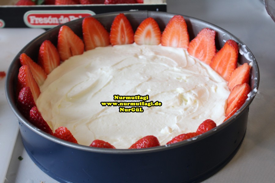 pandispanyamizi ikiye keselim ve kelepceli kaliba tekrar bi kat pandispanya yerlestirelim.. üzerine 2-3 kasik kremayi heryerine gelecek sekilde sürelim.. kalibin kenarlarina ortadan kesilmis cilekleri yerlestirelim… ortasina bolca dogranmis cilek ekleyip heryerine gelecek sekilde yerlestirelim… tekrar bolca kremadan sürelim ve cilekleri krema ile kaplayalim… ikinci pandispanyayi kremanin ve cileklerin üzerine koyalim tekrar krema ile kaplayalim… cilekleri ince ince 4e keselim.. pastamizin üzerini süsleyelim..