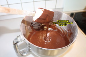 Borcamın tabanına yağlı kağıt koyalım. Üzerine kakaolu HARCI boşaltalım, tepsiye eşit yayalım. Tezgaha birkaç kez vurup havacıklarını çıkartalım. Önceden ISINMIŞ 190-195 derece fırında 20 dakika pişirelim.