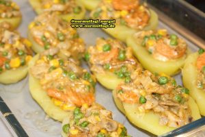 Yapilisi: Patateslerin kabuklarini soyalim, ortadan ikiye keselim, tencereye alalim yaklasik 1,5 litre sicak su ve tuz ekleyip patatesler hafif sert kalacak sekilde haslayalim.. ortasini oymaya gerek kalmadan tüm bir sekilde patatesleri kullanacagiz, bu sekilde ziyan olmayacak.