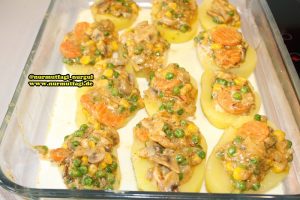 Haslanmis patatesleri borcama alalim.. hazirladigimiz sebze sotesinden birer yemek kasigi alip patateslerin üzerine esit sekilde dolduralim..