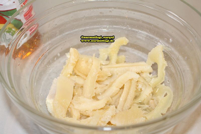 kasaptan aldigim karini bir tasi icine koydum, üzerine yarim cay bardagi kadar sirke döktüm, sirkeyle güzelce ovdum.. üzerine bir bardak soguk su döktüm karistirdim bu sekilde yarim saat beklettim.. sonra birkac sefer durulayarak yikadim.. düdüklü tencereye aldim yaklasik 1,5 litre sicak su koydum ve düdüklü tencerenin kapagini kapatip 25 dakika haslamaya biraktim.. ( haslarken sakin tuz ilave etmeyin gec pismesini saglar ) hasladiktan sonra süzgec ile karinlari cikarttim ve kücük kücük kareler halinde kestim..