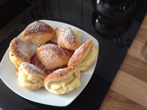Her bir parçayı merdaneyle çok aşırı bastırmadan oval şekilde açıp, ortasına soğuyan muhallebiden 2 çay kaşığı kadar koyup poğaça kapatır gibi kapatın. Ağzına çok bastırmanıza gerek yok. Veya her bir parçanın ortasına elinizle bastırıp,  içli köfte oyar gibi oyun ve küçük külahlar elde edin. İçine muhallebiden koyun ve tepsiye dizin. üzerlerine eritilmiş tereyağı veya normal yağ da olabilir fırçayla bolca sürün. 200 derecelik önceden ısıtılmış fırında üzeri kızarana kadar pişirin. Fırından alır almaz üzerine bolca pudra şekeri serpin.
