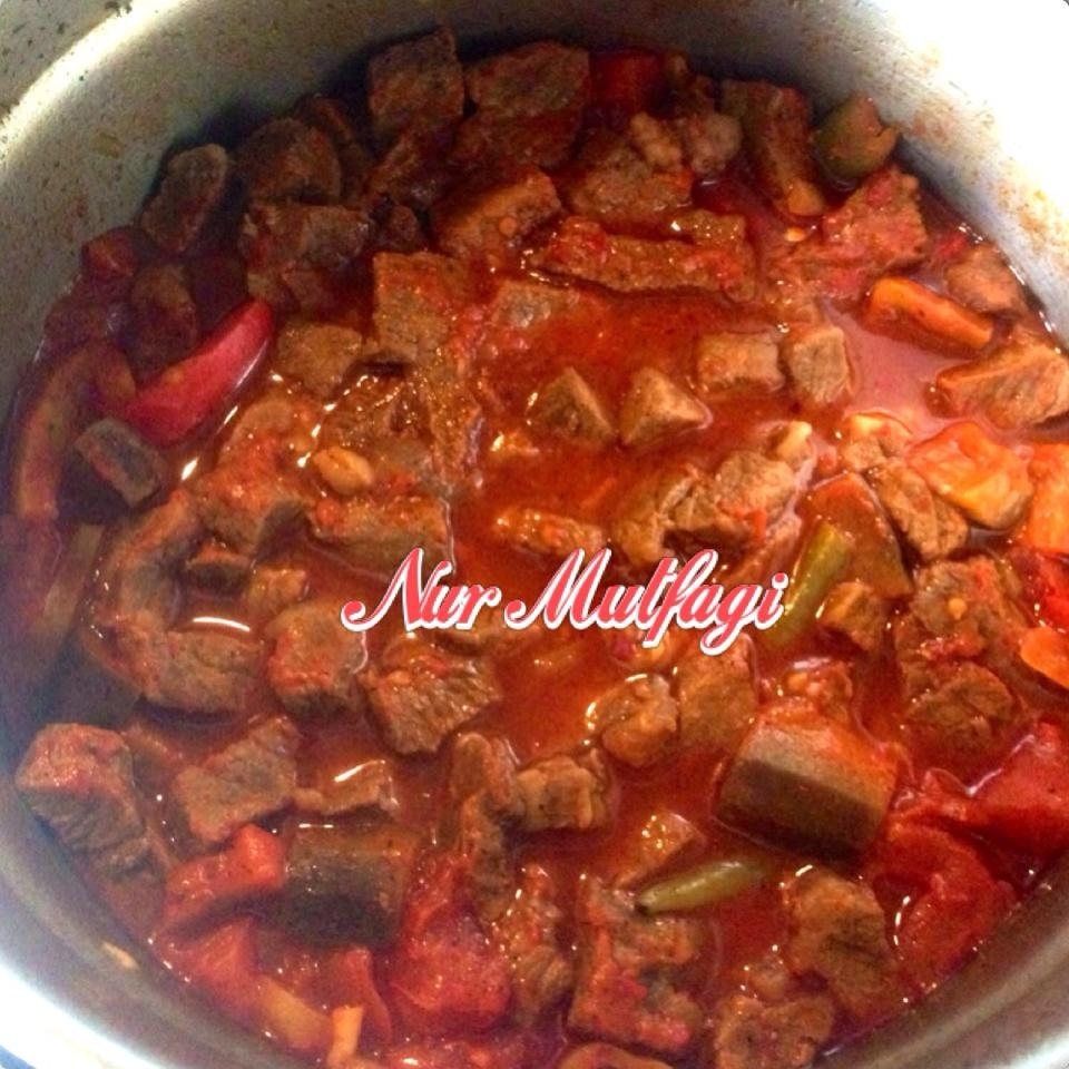 Yapılışı: eti haşlayın. Patlicanları alaca soyut tuzlu 15-20 dk suda bekletin. Soğanı yağda kavurun, patlicanların suyunu sıkıp soğana ekleyip kavurmaya devam edin. Biberleri, sarımsak ve kabuğu soyulmuş domatesi ekleyin tencerenin kapağını kapatın orta ateşte karıştırmadan kavurmaya devam edin. Etleri en üstüne yerleştirin. Ayrı bir tasta salçayı sulandırıp Et’lerin üzerine dökün kapağını kapatıp 10-15 dk kaynatın… Pilav salata acı biber 🙂 nasıl yemek isterseniz servise hazırdır… Afiyet olsun…