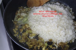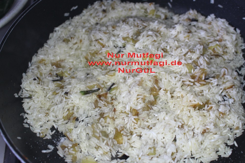 Yapilisi: Pirincleri önceden yikayin… yagi eritin, patlican iclerini kücük dograyin, yaga ekleyip kavurun, pirincleri ekleyip birkac dakika kavurun… suyunu ve tuz biber ekleyip kapagini kapatip suyunu cekene kadar pisirin… afiyet olsun…