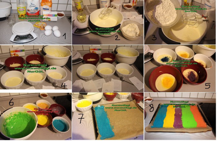 Yapilisi: genis bir kabin icersine yumurtalari kiralim ve sekeri ve vanilya sekerini ekliyelim mixserin yüksek ayarinda sekerler eriyene kadar yaklasik 5 dakika cirpalim… ayri bir kabin icersinde un ve kabartma tozunu güzelce karistiralim bu karisimi yumurtalara 6-7 asamada yavas yavas dökerek mixserle cirpin… sivi yagida 3-4 asamada ekliyerek cirpin… hamuru ister 6 parcaya esit miktarda paylastirin… yaklasik her bir tas bir dolu kepce 110 gr civari esitledim… her bir tasin icersine gida boyalarini dökün ve ayri ayri mixserde güzelce cirpin, her seferinde mixserin basligini silin renkler karismamasi icin… firin tepsinizin altina yagli kagit serin… her tasi esit miktarda ince uzun tepsiye dökün… resimlerde görüldügü gibi… önceden isinmis firinda 180-190 derecede yaklasik 15-20 dakika civari pisirin… pistigini anlamak icin kürdan ile kontrol edin kürdana yapismamissa pismistir…