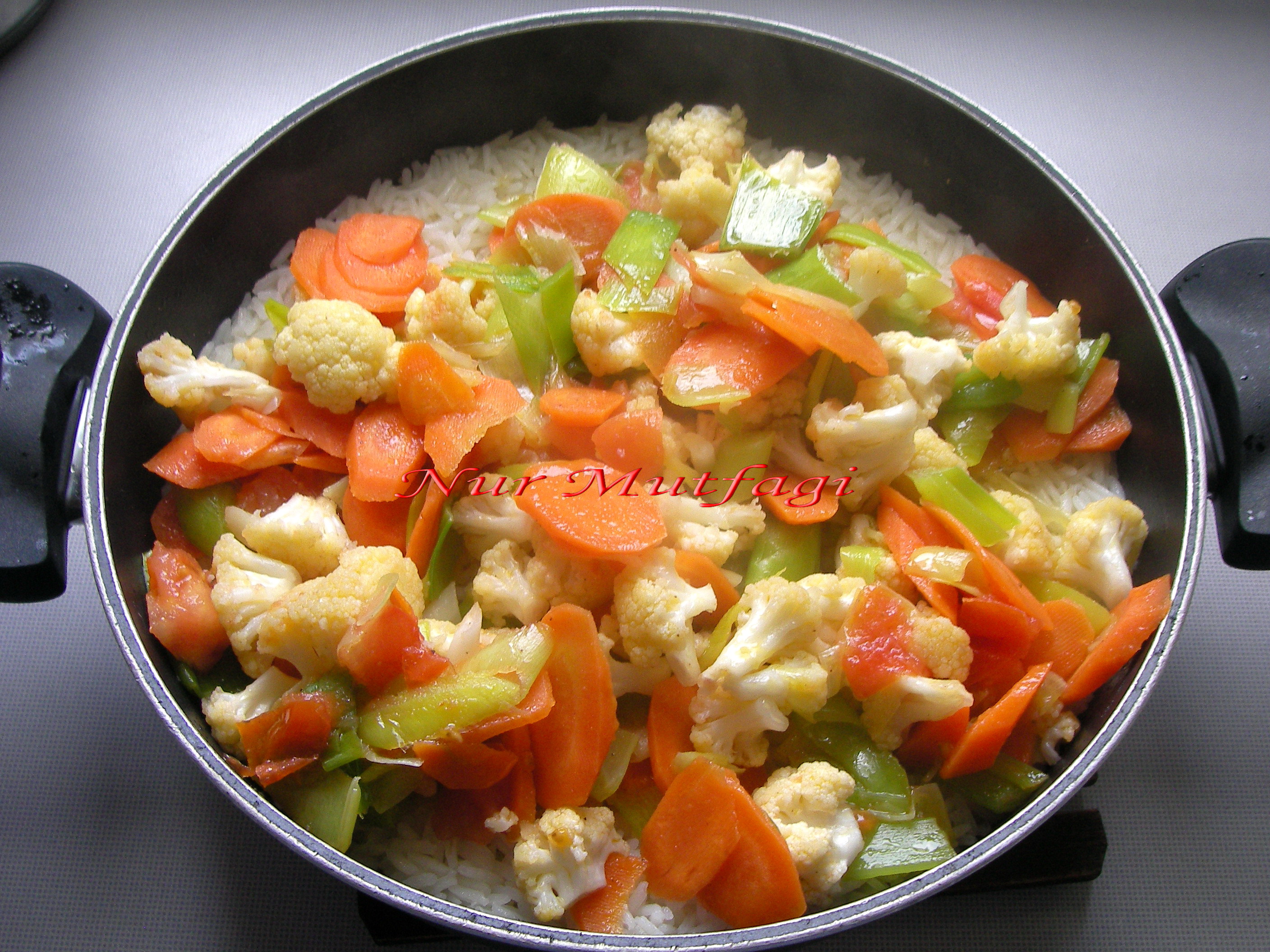 ayri bir tavada sıvıyağ tereyağ karışımı yagda sebzeler yüksek ateste kavrulur, varsa 1 yemek kaşığına yakın tuzot baharat yoksa normal tuz karabiber ve 1 cay bardagi su ilave edilir 5-6 dk sotelenir. suyunu cekmis dinlenmis pilavin üstüne döküp karistirin…