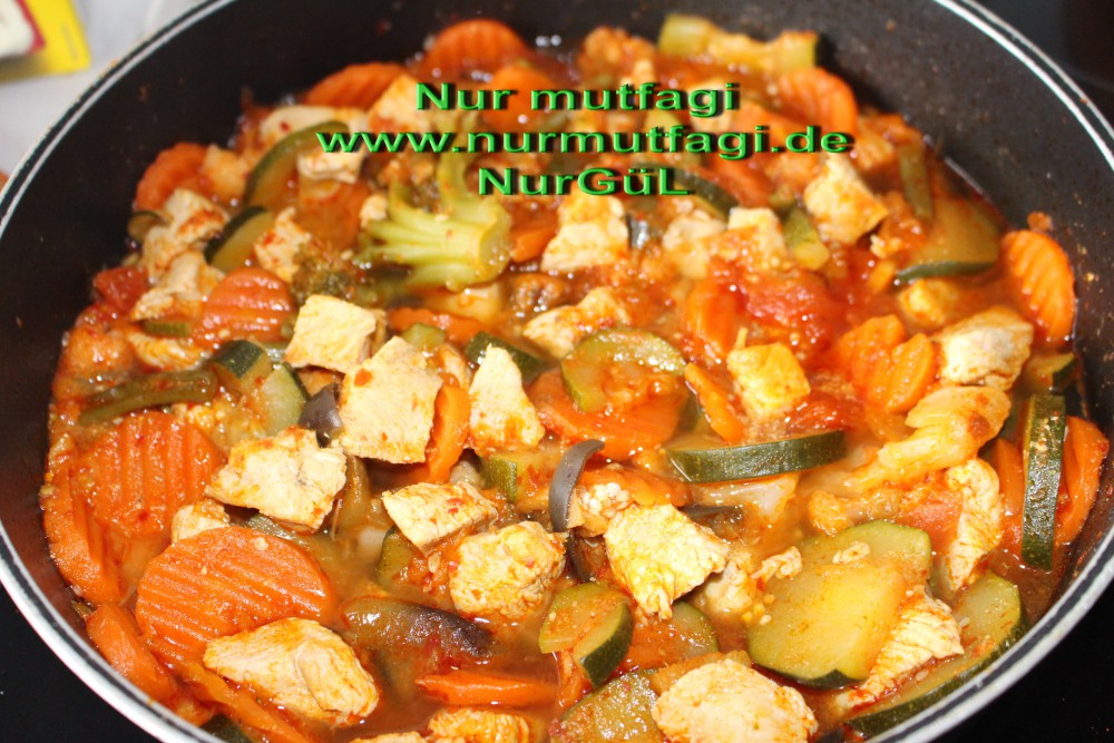 Yapilisi: Hindi etini kusbasi yemeklik dograyin… tavaya tereyagi ve biraz zeytinyagi koyup eti kavurun… havuc, kabak, patlican  yuvarlak ince sekilde dograyin, zencefili rendeleyin… kavurdugunuz hindi etine ilave edip biraz tuz atip yaklasik 5 dk kadar devam kavuralim… domates rendesi, salca ve baharatlari ilave edelim üstü basa suyunuda ekleyip kapagini kapatip pisirelim… pilav veya makarna ile servis yapalim… afiyet olsun…