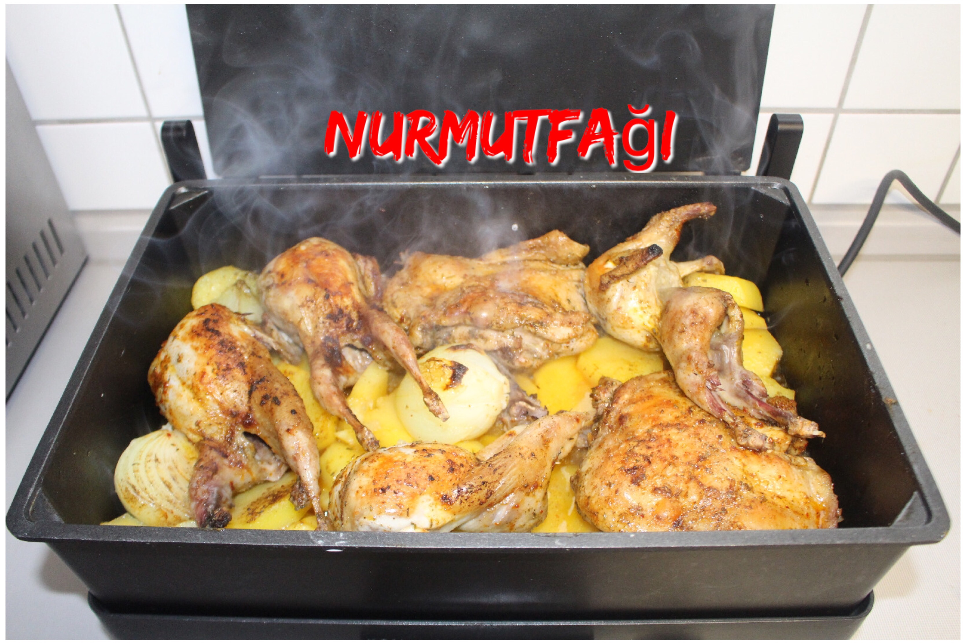 Yapılışı: patatesleri soyup yuvarlak dilim keselim. Silex tavanın tabanına biraz tuzlayarak yerleştirelim.. bıldırcın ve tavuk pirzolayı zeytinyağı ve baharatlarla ovalım..tavaya patateslerin üzerine yerleştirelim.. soğanların kabuklarını soyup 4 dilime keselim, 1 çay bardağı su dökelim.tavamızı önce 5 ayarda sonra 3-4 arası kısarak PİŞİRELİM.. arada kontrol edelim çok çabuk piştiği için dibinin tutmaması İÇİN tekrar bir çay bardak su ilave edelim.. 30 dk içinde bıldırcınlar kızarmış sebzelerimiz yumuşacık olmuştur.. pilav salata İLE servise hazırdır.. afiyet olsun