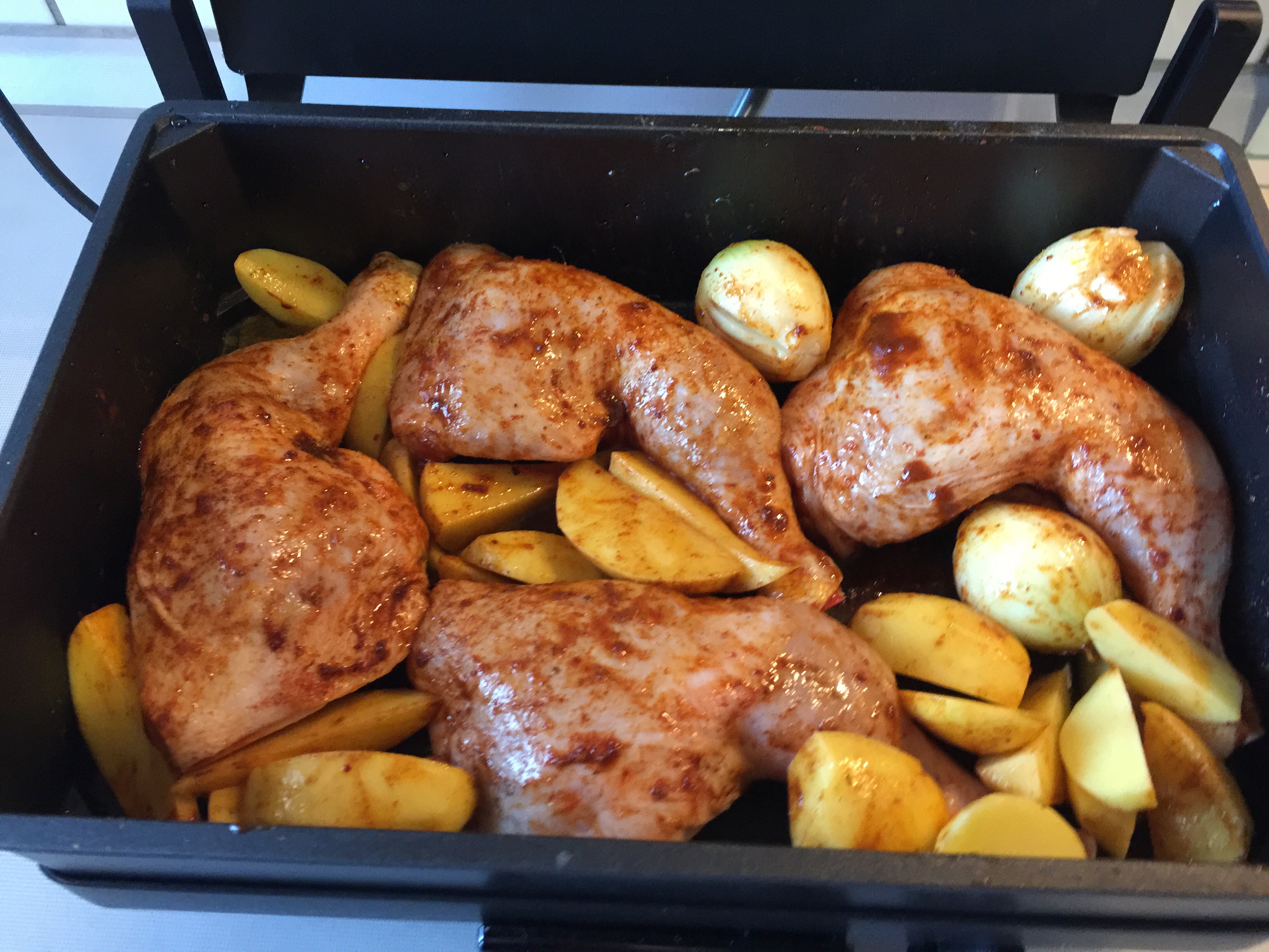 Yapılışı: Silex tavaya tavuk parçalarını, kabuğu soyup dilimlediğimiz patatesleri, soğanı koyalım.. Üzerine zeytinyağı gezdirip baharatları ekleyip güzelce ovalım.. Silex tabamızın kapağını KAPATALIM, 3-4 ayarda pişirelim. Zannettiğimden Çok çabuk pişti. 35-40 dk arası sürdü. Normal fırında 60 dakika sürüyor. Detaylı Yapılış videomu YouTube kanalımdan izleyebilirsiniz.