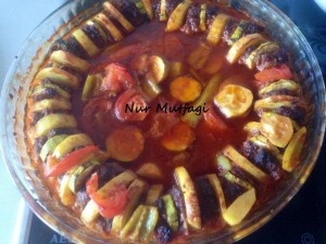 Yapilisi: köfte icin gerekli malzemeler güzelce yogrularak köfte hazirlanir. patates ve kabagi dilim dilim dograyin tepsinin kenarindan basliyarak bir patates, bir köfte, bir kabak seklinde malzemeniz bitene kadar dizin. en son domates ve biber dilimlerini tepsinin ortasina yerlestirin… köftelerin ve sebzelerin üzerine zeytinyagi gezdirin. ayri bir kapta tuz ve salcayi bir bardak su ile sulandirip tepsiye dökün… önceden isinmis firinda 190-200 derece arasi kontrol ederek arada acip suyundan sebzelerin üzerine dökerek pisirin… afiyet olsun