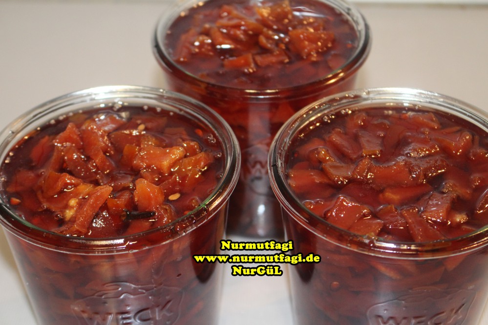 Not: Videomda ayva cekirdeklerini ve karanfili bir süzgecin icine koyup öyle kaynamaya birakmistim, yanliz bu sekilde hosuma gitmedi istedigim rengi birakmadi. sonra süzgecten cikarttim ve öyle kaynattim, sonucu super oldu gida boyasi kullanmadan kipkirmizi renkte ayva recelim oldu.. sizde direk cekirdekleri icine atin ve ayvalarla birlikte pişirin.