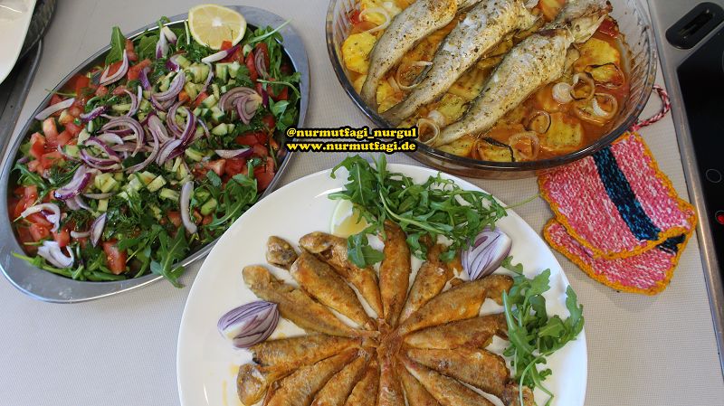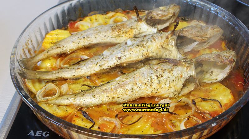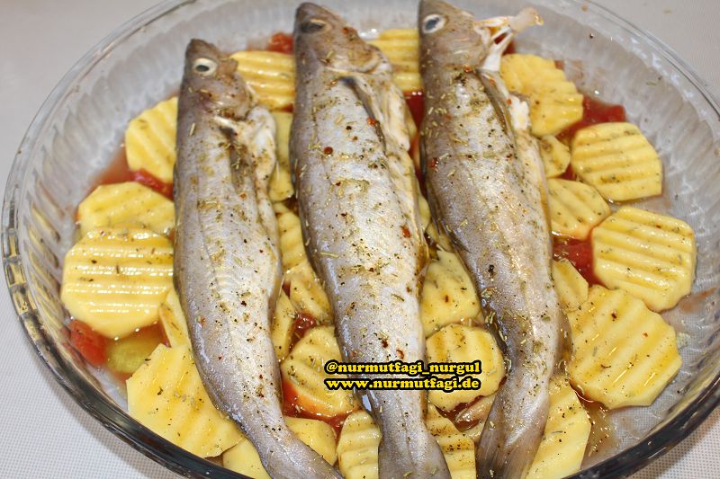 YAPILISI: baliklari temizleyelim, firin tepsisine domates rendesini, patates dilimlerini alalim üzerine biraz zeytinyagi gezdirelim, tuz karabiber serpelim, baliklari patateslerin üzerine yerlestirelim. bir tasin icinde sos hazirlayalim.. karabiber, tuz, az kekik, kirmizitozbiber pulbiber, sarimsak rendesi ve yarim limonsuyunu ekleyip karistiralim. bu karisimi baliklarin icine disina heryerine firca ile sürelim.. sogani dilimlere keselim halka halka yapalim.. önceden isinmis 190 derece firinda yaklasik 30 dakika pisirelim..