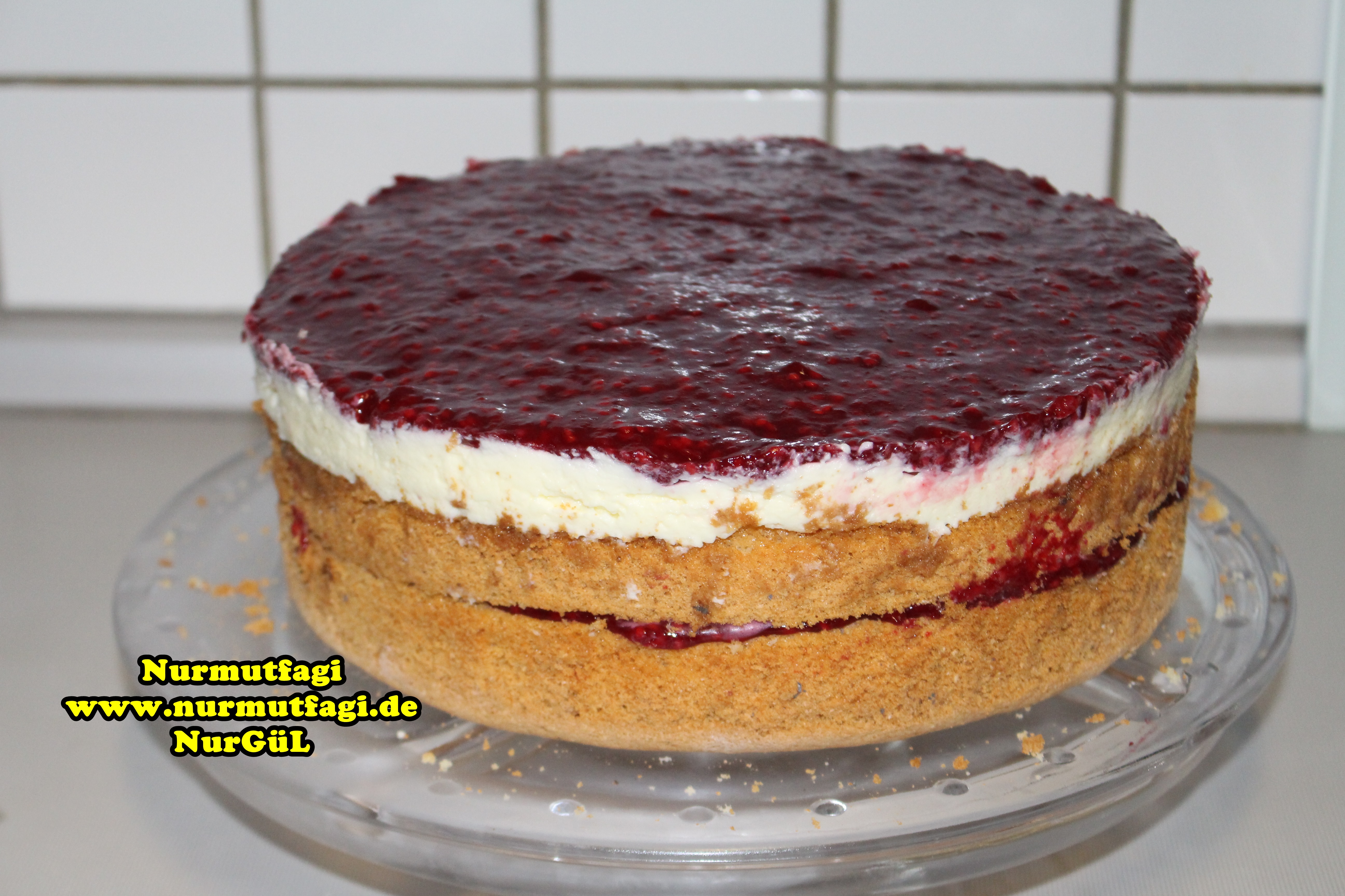 Pandispanyamız soğuduktan sonra ortadan ikiye keselim.. Servis tabağına Pandispanyanın tek katını koyup kelepçe takalım.. Frambuaz Meyve sosumuzun yarısını döküp yayalım..üzerine KREMANIN yarısını eşit sürelim. Diğer Pandispanya katını koyalım. Geri kalan kremayı üstüne döküp yayalım, frambuaz sosunda KREMANIN üzerine düzgünce yayalım.. Bu şekilde buzdolabına kaldırıp sosun donmasını bekleyin, acil durumda buzluğa 20-30 dk atın. Kalıbı Pastamızdan çıkartalım, kenarlarını süsleyelim.