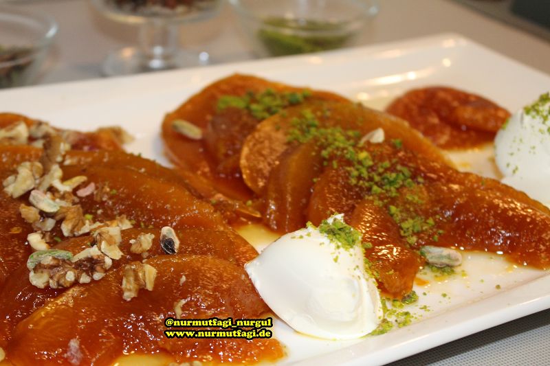 suyunu süzüp tekrar yikadigim kabaklarin üzerine yaptigim serbeti döktüm ve orta ateste 30 dakika pismeye biraktim, sonra borcam tepsiye bosalttim, önceden isinmis 200 derece firinda yaklasik 30 dakika kadar pisirdim.. ben dayanamayip hemen sicak sicak tadina baktim 🙂 soguduktan sonra servis tabagina kaymak fistik ve ceviz esliginde servis yapalim.. isterseniz tahin gezdirebilirsiniz.. kirecteki gibi citir citir bir tatli olmadi, yumusakti yanliz lezzeti nefisti arkadaslar, belki ben ince kestigim icin böyle oldu, siz kabaklari daha kalin kesip öyle deneyin, yapan arkadaslardan websitemize, youtube kanalima, facebook veya instagram sayfama yorumlarinizi bekliyorum.