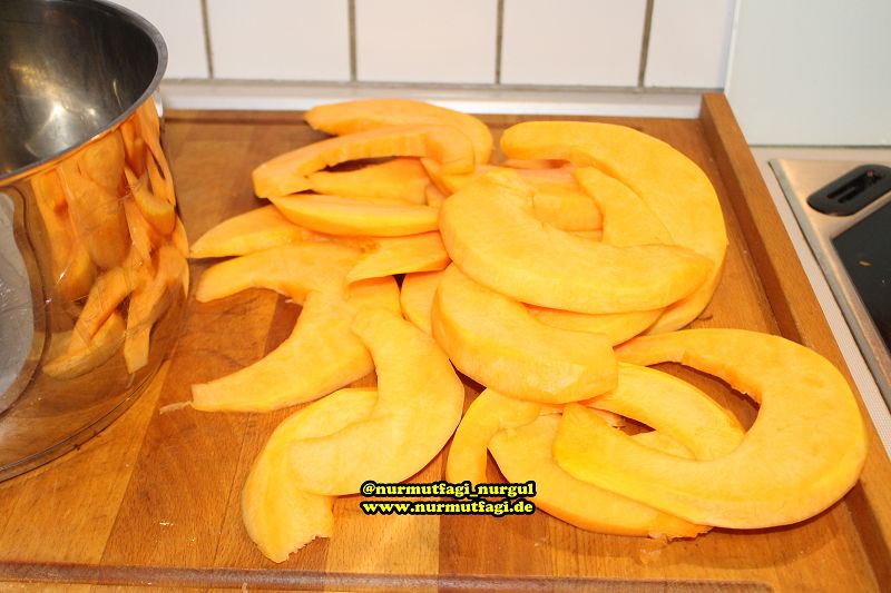Yapilisi: balkabagini yikayalim, ortadan bölelim, kalinca dilim dilim keselim, her kestigimiz dilimin disindaki sert kabuklarini keskin bir bicakla veya patates soyma bicagi ile soyalim.. ben soyduktan sonra arkadaslar gördügünüz gibi ay seklinde ve biraz ince dilimlere kestim.. ince kestigim icinde daha cabuk pistiler, eger siz ince kesmek istemezseniz daha kalin ve kareler halinde kesebilirsiniz.. tercih size kalmis. ama biraz kalin kesmenizi tavsiye ederim, sunum icin daha güzel görünür 🙂