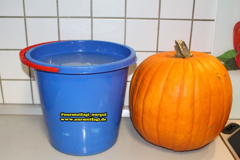 2. Asama: iki cesit balkabagi kullandim, türk ve alman balkabagi, ikiside muhtesim oldu, bana sorarsaniz alman balkabagi ile kirecte kabak tatlisi benim icin daha bir lezzetliydi. Balkabaginin kabuklarini kesip kalin karpuz dilimler gibi dograyalim.. dogradigimiz dilimleri tencereye alalim… bir gün beklettigimiz suyun üzerinde ince bir kirec kaymagi olusacaktir. bu kaymagi isterseniz alip atin isterseniz kullanabilirsiniz. kirecte beklettigimiz kirec suyunu bir tasla veya kepceyle suyu bulandirmadan altaki kireci almadan yavas yavas berraklasmis suyu alip kabaklarin üzerine üstü basa gelecek sekilde dolduralim.. kabaklar suyun üstüne cikmamasi icin üzerine bir tabak kapatalim agirlik yapalim. bu sekilde tekrar bir gece bekletelim.. kirecli suda bekletince kabagimiz kitir kitir olacaktir…