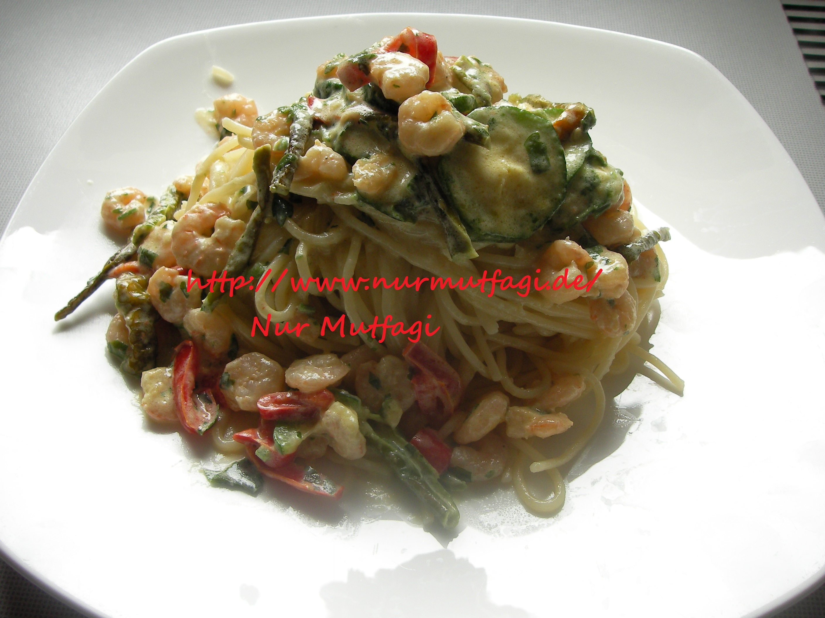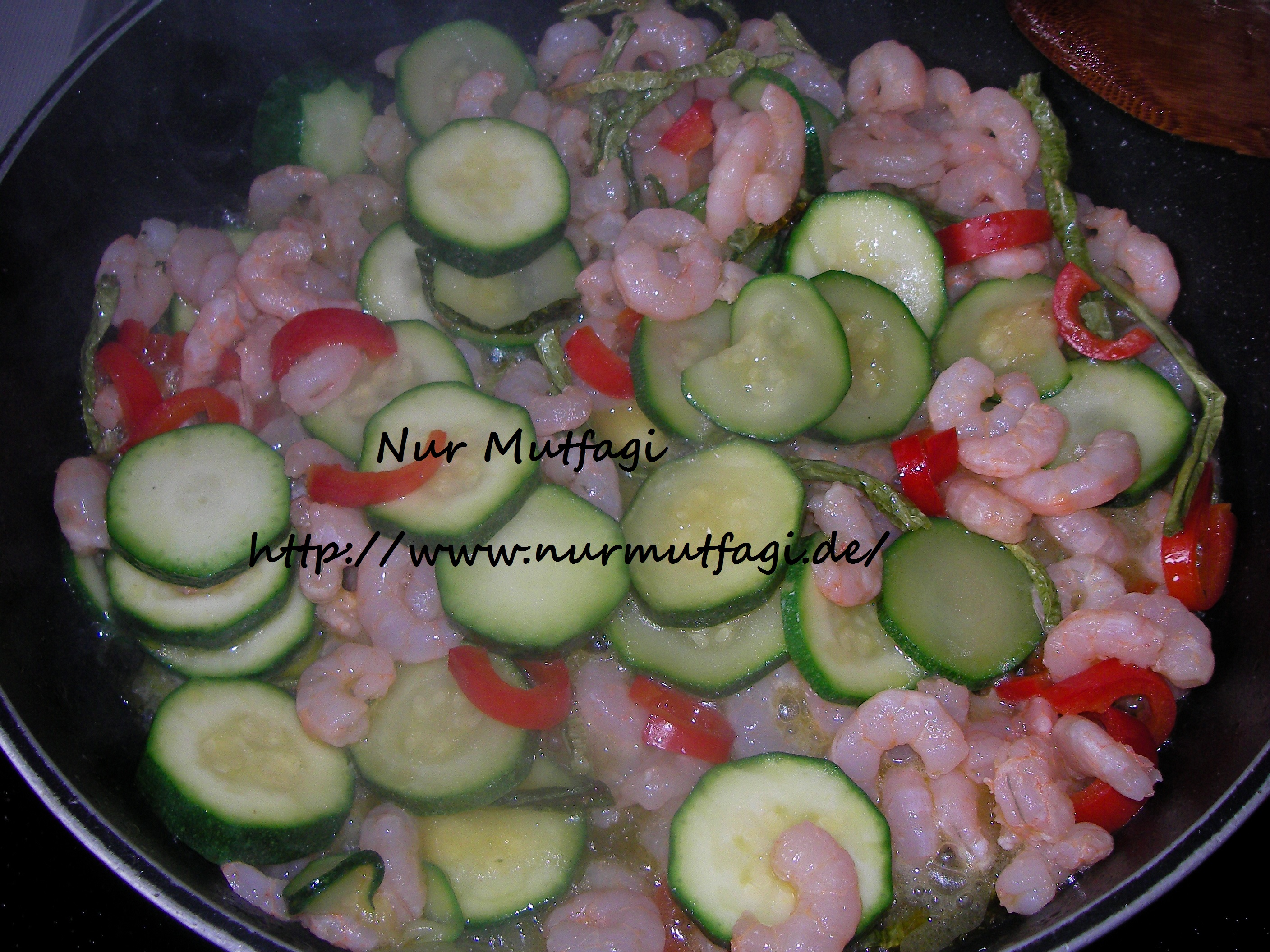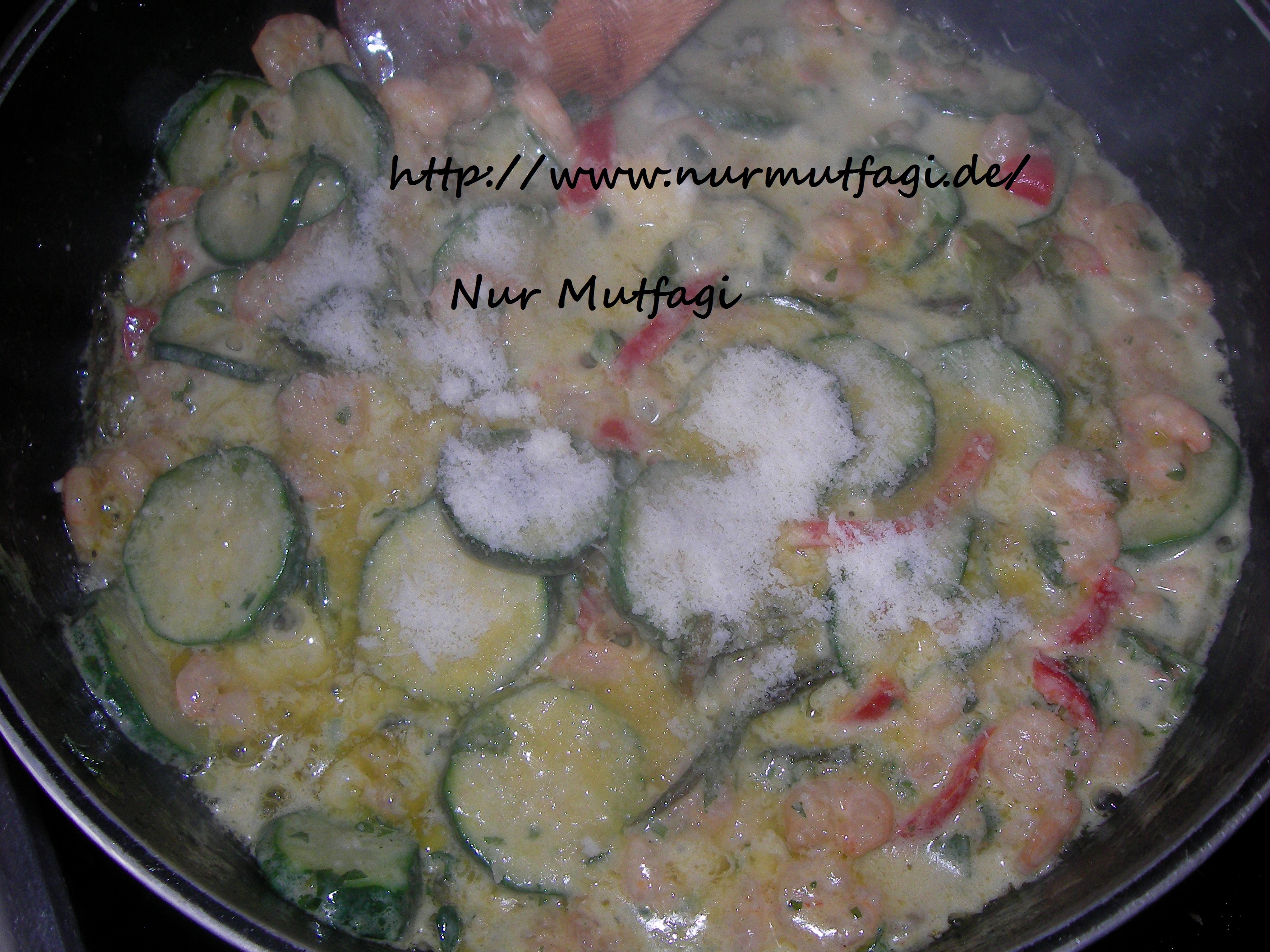 Yapilisi: Kabak ve biberleri dograyin, kizgin zeytinyaginda mini karideslerini renk alana kadar kizartin, kabak ve biberleri ilave edip kavurmaya devam edin… kremayi yavas yavas ekleyin birkac dk pisirin, parmesan peyniri ve baharatlarida ilave edip özlesene kadar orta ateste pisirin, servis yapmadan önce kiyilmis maydonoz ekleyip karistirin … haslanmis spagetti tabaga alip üzerine sosdan döküp servis yapin… afiyet olsun
