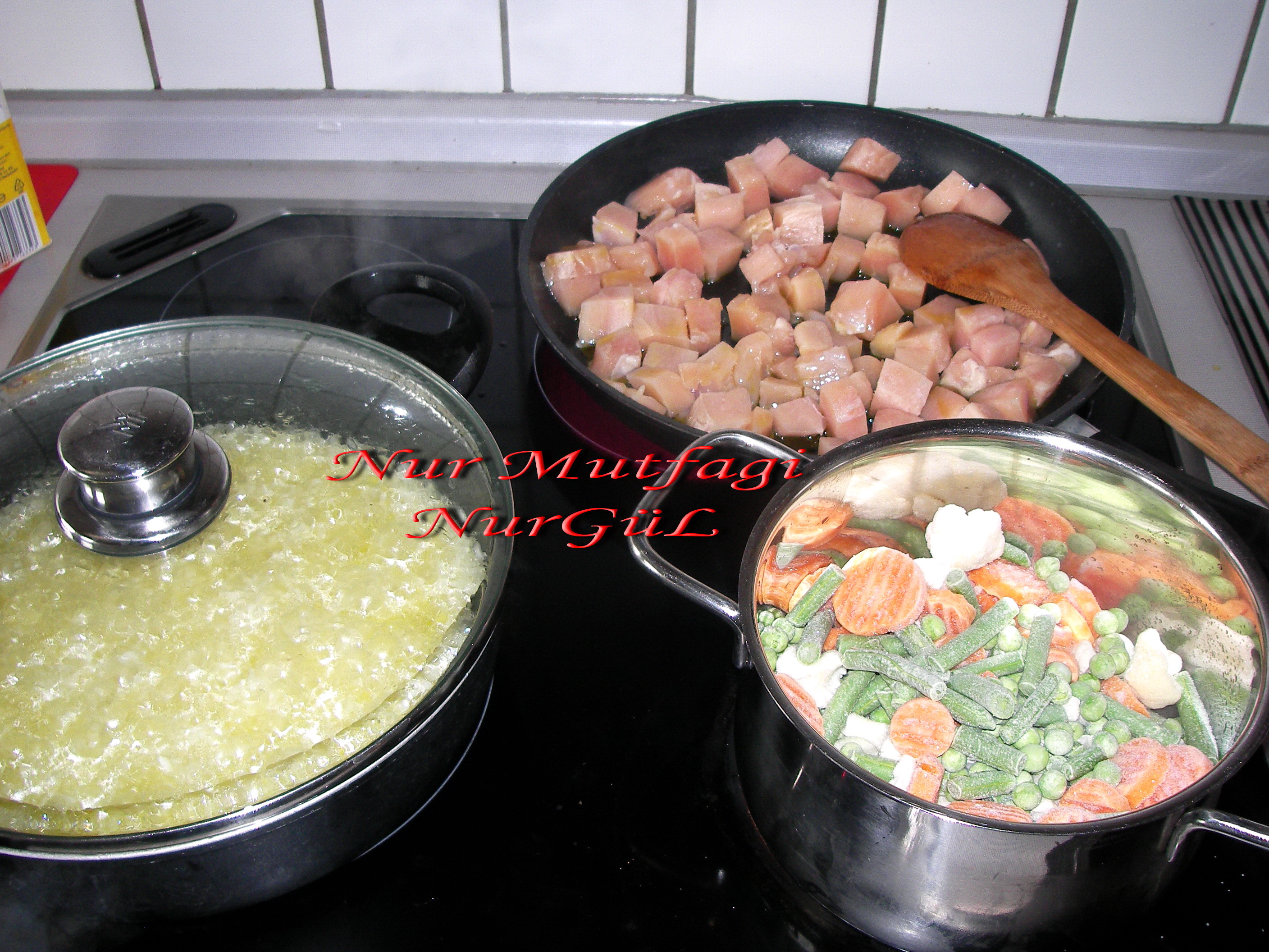 pilavi yapmak icin kullandiginiz bardak ile  1 bardak pirince  2 bardak su kullanarak pilavinizi yapin. sebzeler kisa süre 5-8 dk haslanir… servis tabaginiza koyulup servise sunulur… afiyet olsun…
