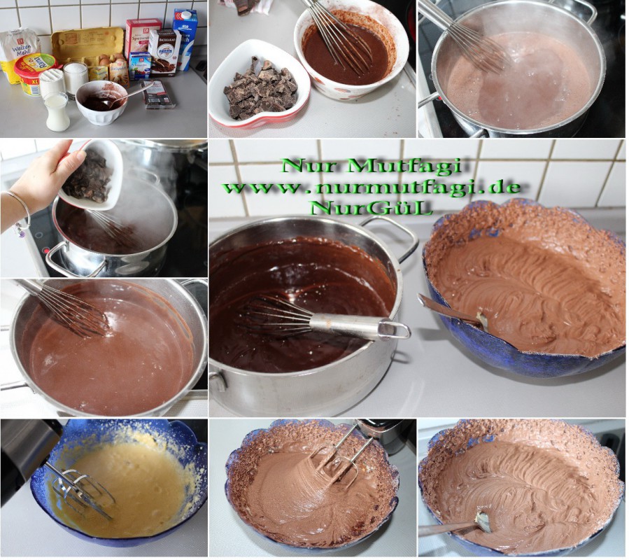 Hamurun yapilisi: yumuşak margarini mikserde cirpin şekeri ilave edip devam mikserde cirpin.Yumurtaları tek tek ilave edin süt ekleyip karıştırmaya devam edin. En son un, kakao ve kabartma tozunu ekleyip son kez karıştırın. Elde ettiğiniz kaşımın yarısını yagli kagit koydugumuz kelepçeli kalıba dökün. ( kelepceli kalibin capi 24 cm olani kullandim ) Üzerine soğuttuğunuz kakaolu sosu döküp kenarlara fazla yaklaştırmadan yayın.En üste kalan hamuru döküp kaşık ile düzeltin.180 C derece de ısıtılmış fırında 30-35 dk. pişirin.(pişip pişmediğini kürdan ile kontrol edin.) Fırından çıkartin dagilmamasi icin  soğuduktan sonra kelepcesini cikartin, tamamen soguduktan sonra üzerine pudra şekeri serpelim…