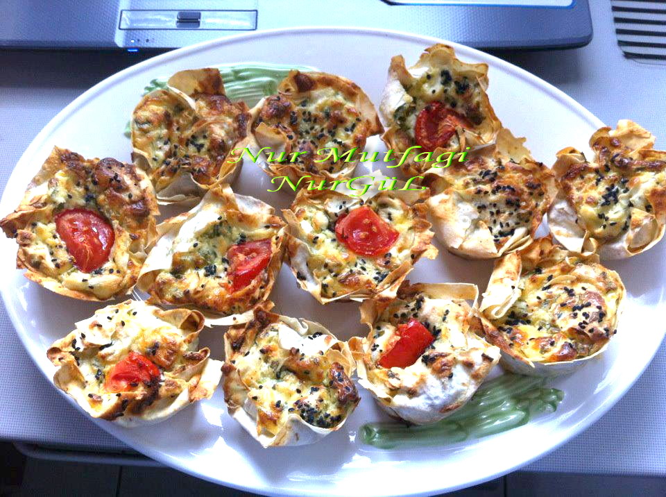 kaşık yardımı ile kalıptaki yufka çukurlara yufkalı karışımdan her bir parçaya eşit olacak şekilde doldurun, üzerlerine çörek otu serptin önceden isinmis 200 derecede firinda ortalama 40-45 dak.pişirin afiyet olsun.