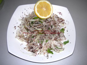 Yapilisi: sogani piyaz dogruyoruz, tuz atip elimizle ovuyoruz aci suyunu cikmasini sagliyoruz ve süzgece koyup suda yikiyoruz. servis tabagina alip üzerine sumak, tuz, biraz limonsuyu ve zeytinyagi gezdiriyoruz,  bir kücük tutam maydonoz kiyip karistiriyoruz… et yemeklerin yaninda, kisirin yaninda harika bir lezzet… afiyet olsun
