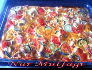 sebzeleri yikayip kesin. Sogani 2 yemek kasigi yagda kavurun sonra etleri ilave edin suyunu cekene kadar pisirin… baharatlar ile tuz karabiber kirmizitozbiber ile tatlandirin. Bu karisimi bir kaba alip ayni tavaya 2 kasik yag koyup biberleri ve kabaklari 5 dk kizartin baharatlayip sogutun. baska bir kapta Yumurta Schmand yani eksimis krema tuz karabiber